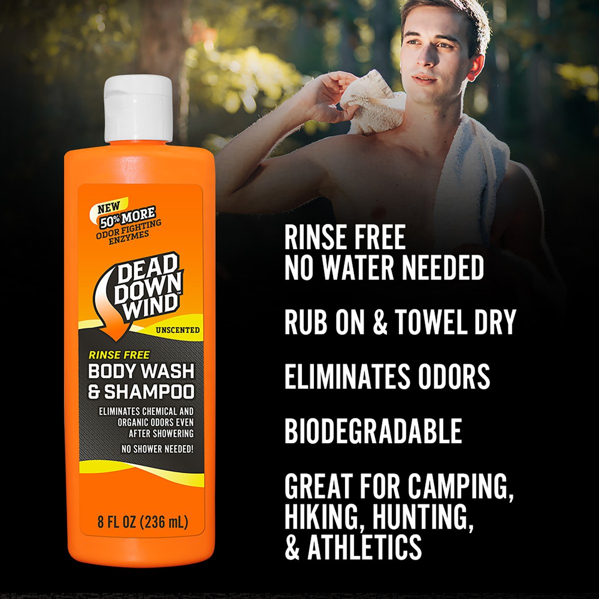 No Shower• No Problem! Designed with the outdoor enthusiast in mind, the Dead Down Wind Rinse Free Body & Hair Wash is perfect for every outdoor activity. Dead Down Winds Rinse Free Body & Hair Wash is comprised of a biodegradable formula that is ready to use straight out of the bottle. No water or shower is required, just apply and wipe off.