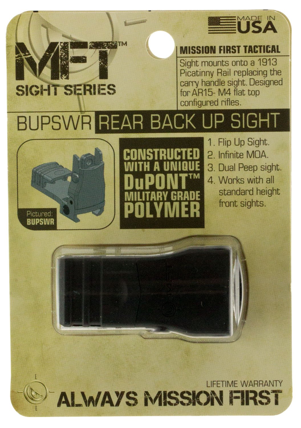 The Polymer Flip Up Rear Sight with Windage Adjustment mounts onto a 1913 Picatinny Rail. A flat head screw driver is required to adjust infinite MOA by 0.25 MOA increments. Unlike other backup sights MFT has developed a shroud that shelters the aperture from debris and impact damage when not deployed. Dual peep sight, same plane aperture allows for perfect cowitness. A slim profile allows the sight to sit under most optics.