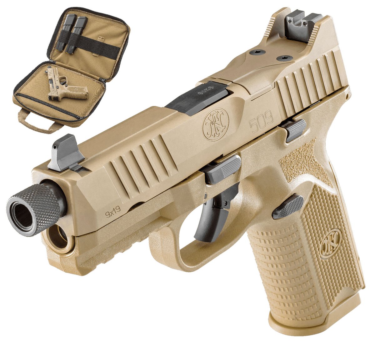 The FN 509 Tactical an extension of the FN 509 family is based on FN's submission pistol that the U.S. Army tested for its Modular Handgun Trials but includes the significant improvements to the design that were implemented in the FN 509. The pistol features the company's patent-pending Low-Profile Optics Mounting System that enables the platform to accept more than ten commercially-available miniature red dot (MRD) optics that co-witness with the suppressor-height night sights and remain adaptable to future optics releases with no requirement of direct milling of the slide. The slide cap for use when not shooting with an optic has raised sight wings that protect iron sight alignment if the pistol is dropped or jostled and provides a textured ramp for racking the slide against a belt loop pant pocket or boot. An FN-signature 4.5-inch cold hammer-forged stainless-steel barrel with target crown ½ x 28 threads that accept the bulk of 9mm suppressors available and thread cap with integrated O-ring to prevent loosening during use complete the top end. Lastly the 24-round magazines nearly identical in length to the pistol's slide maximize ammunition capacity without impacting carry convenience. - Caliber: 9mm - Operation: Double-action - Mag Capacity: 10 or 17/24 Rd. - Weight: 27.9 oz. - Barrel Length: 4.5 - Overall Length: 7.9 - Twist Rate: 1:10 RH - Height: 5.75 - Width: 1.35 - Trigger Pull: 5.5 - 7.5 lb. - Sight Radius: 5.79 - Primary Features - Striker-fired autoloader - 5.5 to 7.5 lbs. Trigger pull - FN Low Profile Optics Mounting System - Threaded Barrel - Suppressor Height Night Sights - SLIDE - FN Low Profile Optics Mounting System - Sight Protecting Slide Cap - External extractor; loaded chamber indicator - BARREL - Cold hammer-forged stainless steel - Recessed target crown - Polished chamber and feed ramp - 1/2 x 28 threaded Barrel - O-Ring retention thread cap - FRAME - Enhanced grip texture which enables faster follow-up shots in all conditions - Interchangeable backstraps - MIL-STD-1913 accessory mounting rail - OPERATING CONTROLS - Fully ambidextrous slide stop lever and magazine release - MAGAZINE - High visibility low-friction follower; polymer base with black finish - SHIPS WITH - Two interchangeable backstraps - One 17-round and one 24-round magazines - Owner's manual - Locking device - FN logo soft pistol caseSpecifications