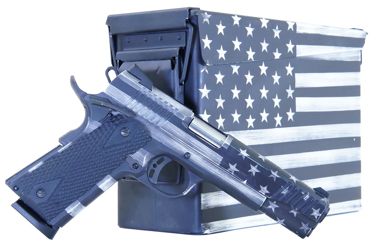 Citadel 1911 Flag pistols features a Series 70 firing system, forged steel frame and slide with an extended slide stop, skeletonized hammer and trigger, lowered and flared ejection port, beveled magazine well and an extended ambidextrous thumb and beavertail grip safety. The full size model has a 5" barrel with a full size guide rod and comes with two 8-round magazines. Includes two magazines and matching Cerakoted ammo can.Specifications
