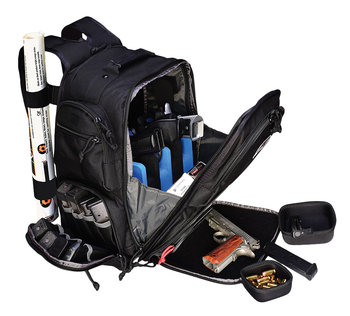 The Executive Backpack is designed for the shooter who needs to transport his handguns to and from the range without anyone knowing what is in the pack. The Executive has an removable foam cradle the holds five handguns securely inside the pack. This pack features 16 removable Visual I.D. icon patches to place where you want, and to help you store and protect your shooting accessories. Specialized pockets in the front of the bag are velour lined to protect fine shooting glasses and custom molded ear pieces. It also includes two ammo dump cups to hold bulk ammo and other small parts if needed. The Executive Backpack also features a computer storage pocket; the padded storage pocket will fit up to a 15" screen laptop while you travel. Pull out rain cover protects gear from a sudden rain and lockable heavy duty YKK zippers provide added security.
