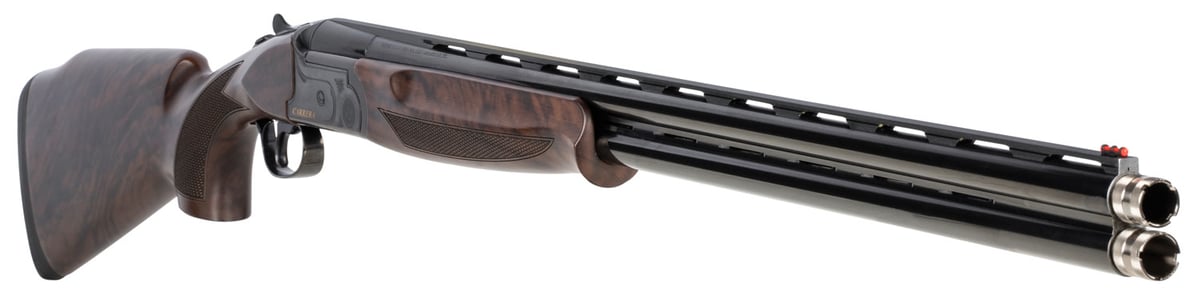 This Carrera Giovane shotgun features a Monte Carlo style stock with a goose brake grooved forend. It also has a black adjustable single trigger and an ejector.Specifications