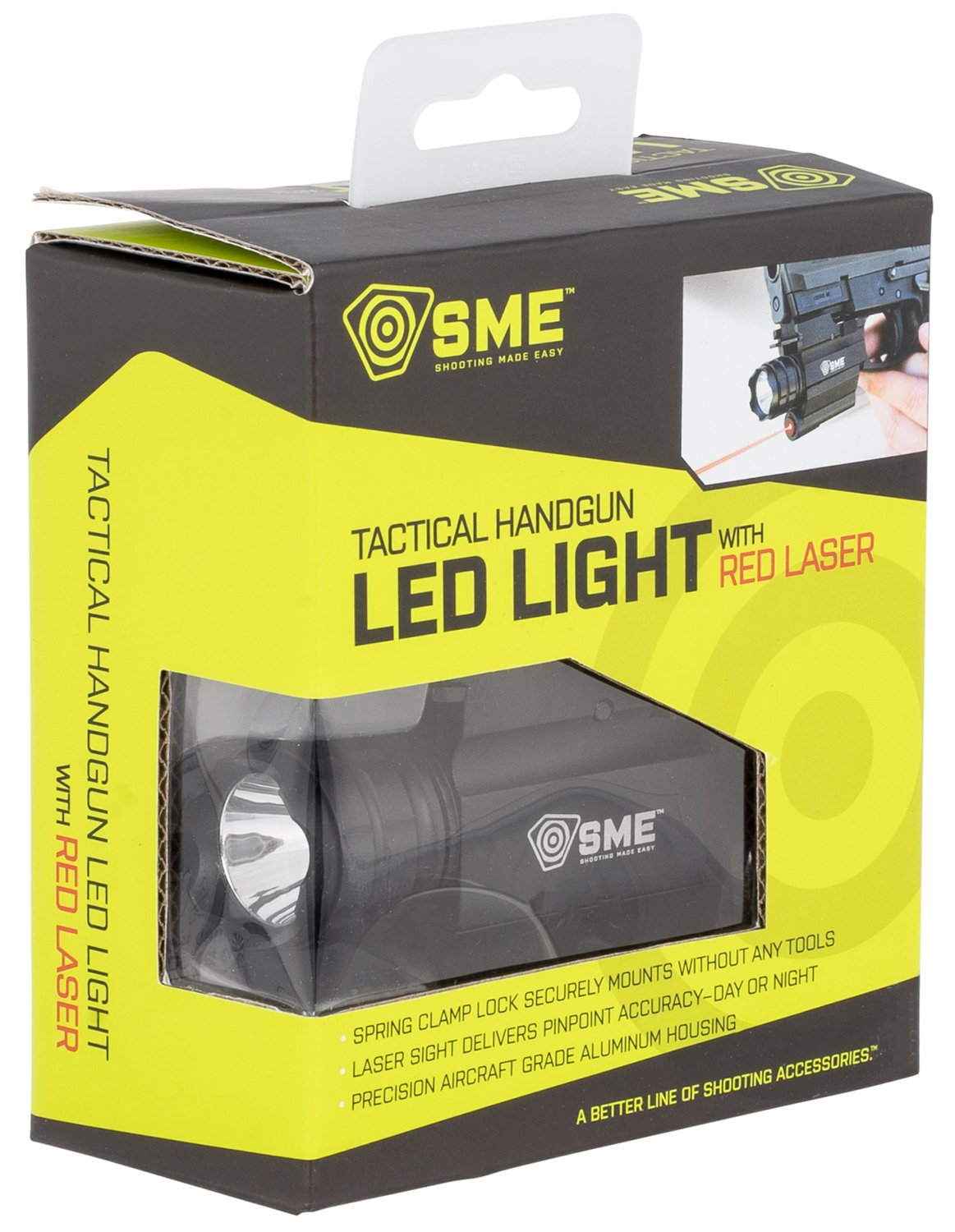 Get a 165 yard beam distance with the SME Tactical Handgun LED Light/Laser combo. It mounts to your pistol's bottom rail with a spring clamp lock. The light is constructed of aluminum with an optimized projection cup, Cree LED bulb and is water resistant. Included is one CR123 battery and one CR1/3N battery.