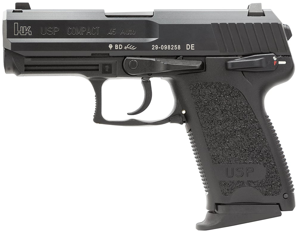 USP45 Compact (V1) DA/SA safety/decocking lever on left two 8rd magazines - Corrosion proof fiber-reinforced polymer frame - Grooved target triggers - Polygonal bore profile for increased velocity easier cleaning and longer barrel life - Can be converted to any of nine trigger firing modes - Specially designed captive recoil spring assembly with polymer absorber bushing - Choice of corrosion resistant •Hostile Environment• blued finish or stainless steel slide - One piece machined slide made from nitro-carburized steel - No snag bobbed hammer - Flared recurve trigger guard - Choice of flat and extended floorplate magazines - Universal mounting grooves for installing accessories - Ambidextrous magazine release lever - Contoured extended slide release - Extractor doubles as a loaded chamber indicator - Patented Lock-Out Safety device