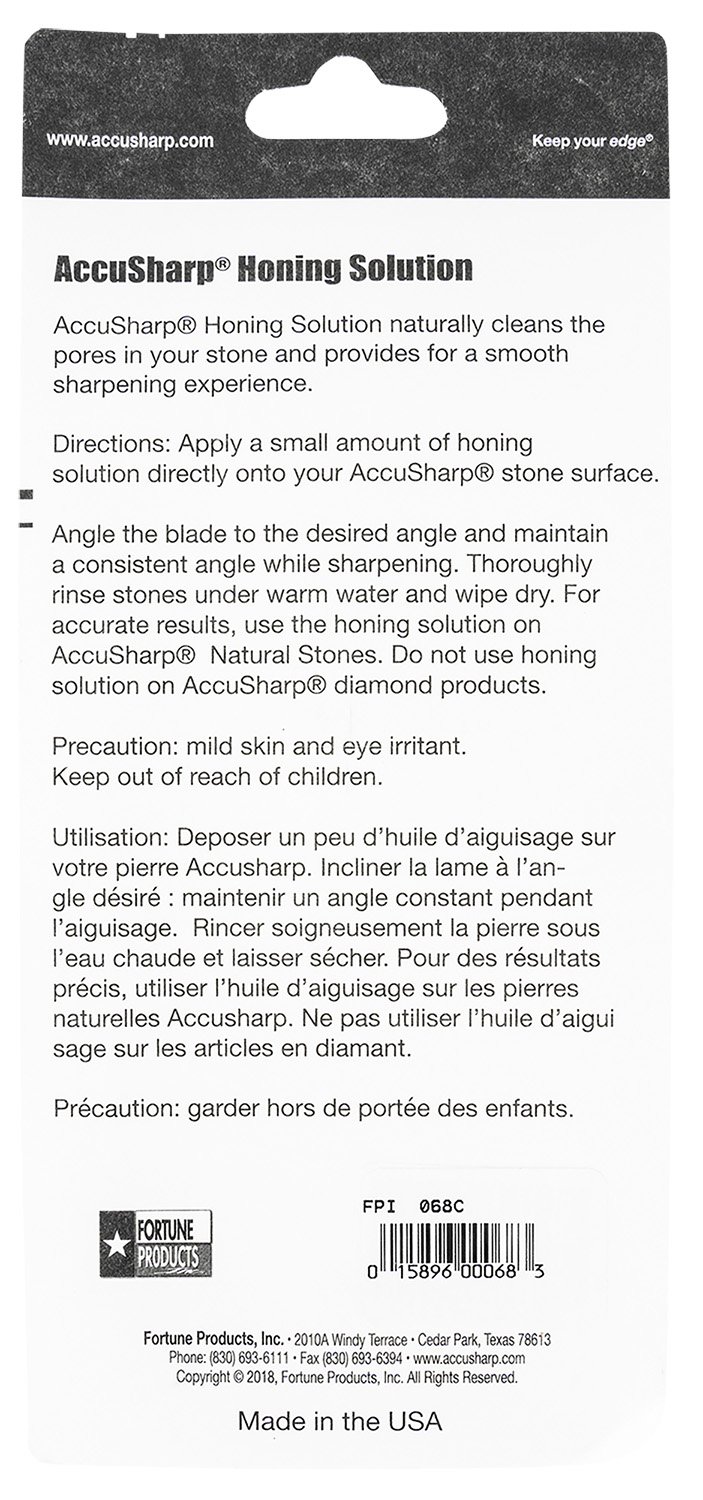 AccuSharp Honing Solution is ideal for all traditional natural stone sharpening. Honing Solution protects the stones from clogging and provides smooth sharpening.