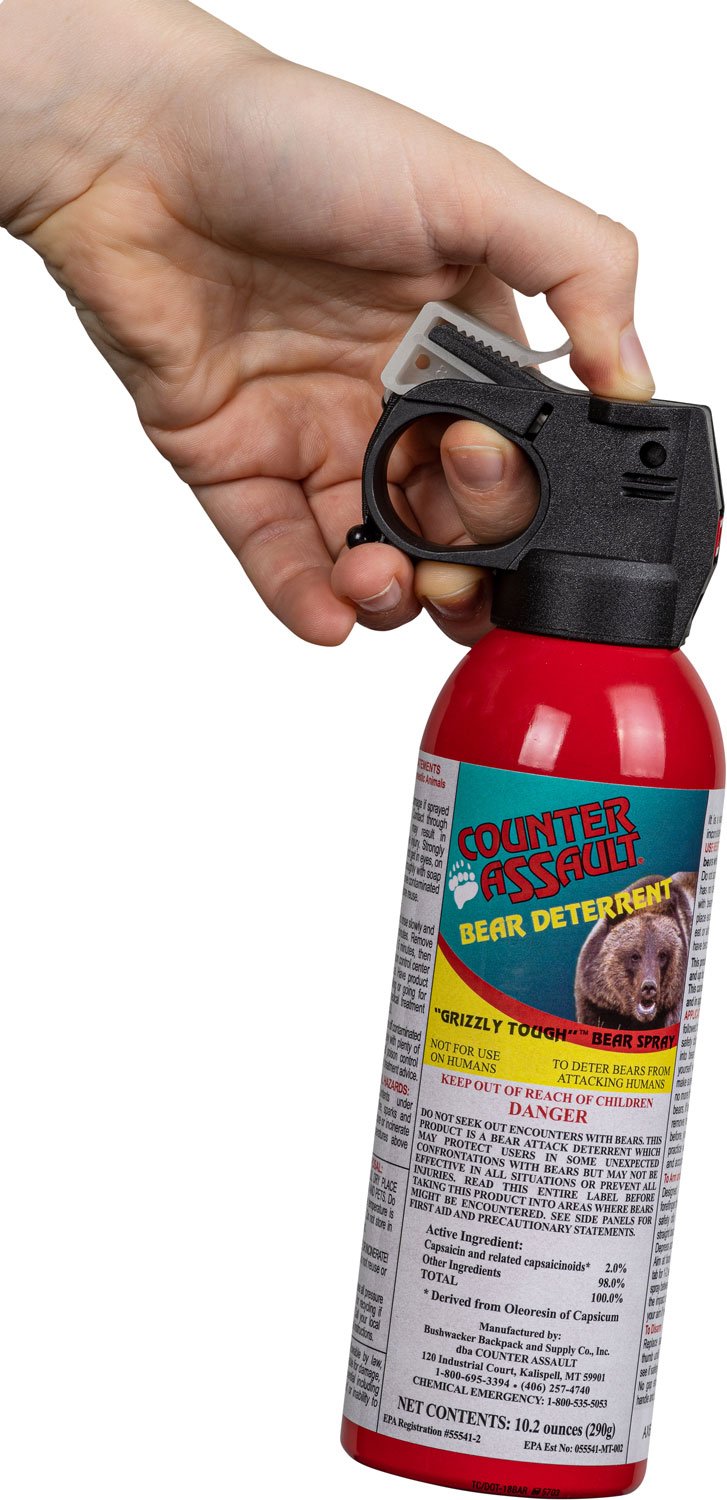 Counter Assault Bear Deterrent pepper spray was developed, in conjunction with the University Montana, as a means to protect people from bears in a non-lethal manner. Works on all bear species to deter bears from attacking humans with a 40ft spray distance at a 8 seconds spray duration. Counter Assault Bear Deterrent is lightweight, easily carried on the belt of a hunter, fisherman or backpacker. Contains 2% Capsaicin and related Capsaicinoids, the maximum allowed by law. Can has a Glow in the dark safety wedge with tie string. Made in Montana.