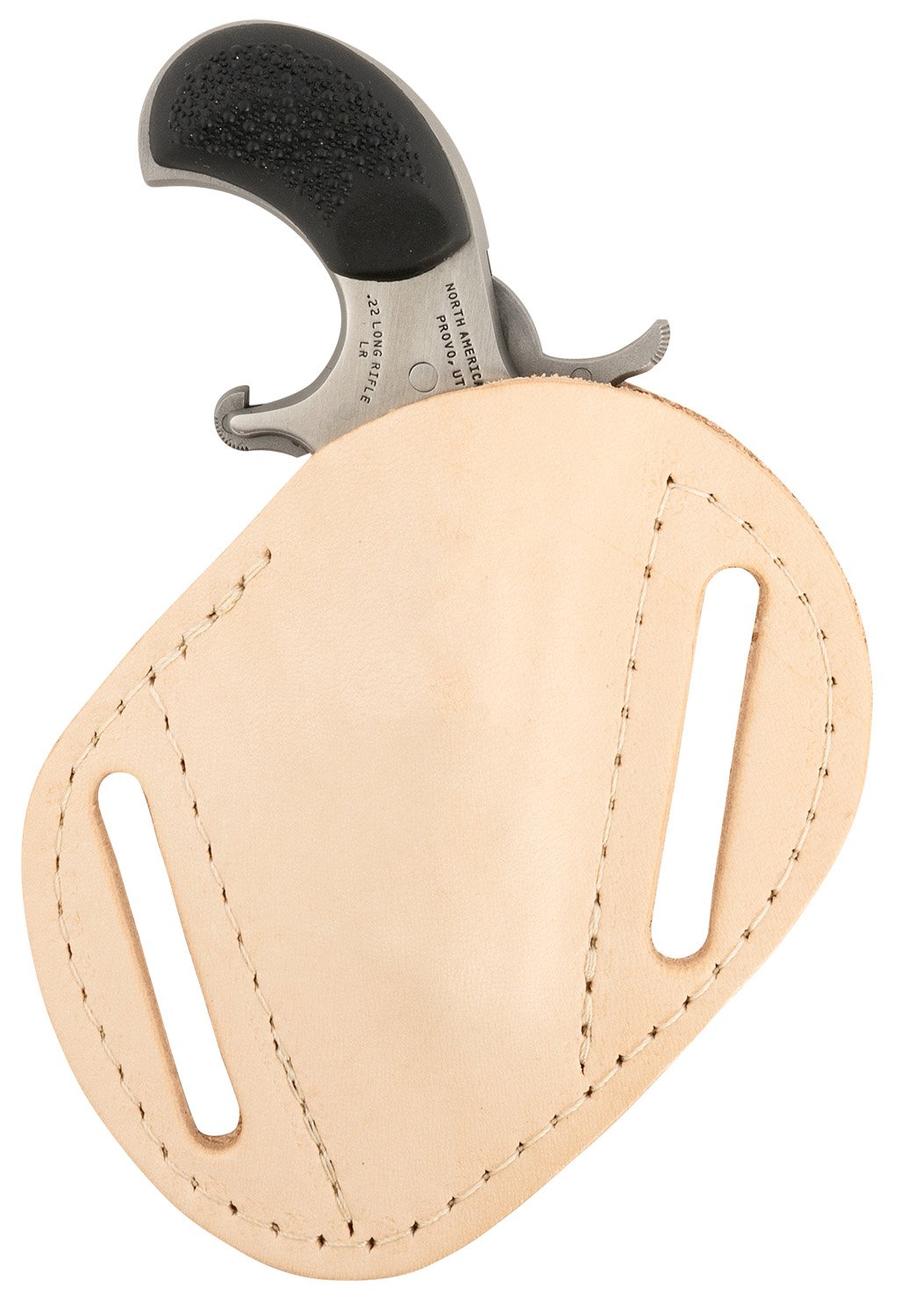 NAA'S Mini Revolver is small, easy to conceal and safe to carry. This gun is lightweight and has a 5-shot capacity. Using the half-way notch cylinder, the hammer may rest safely and securely away from live or empty chambers without chance of accidental discharge. It has black, textured rubber grips a 1 1/8" barrel, and a stainless steel metal finish. Includes a strong side carry holster.Specifications