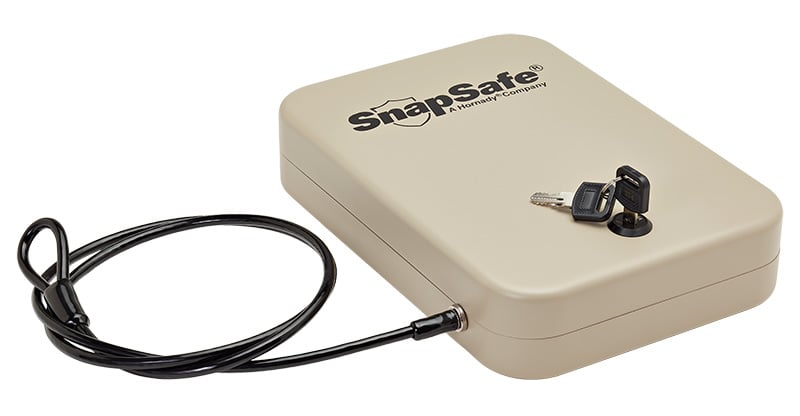 The SnapSafe® Lock Box provides secure storage for handguns and other valuables at home on a nightstand in the car or when traveling. All SnapSafe Lock Boxes come with a heavy duty 1500 lb. rated steel cable that secures to any stationary object including a vehicle seat or heavy piece of furniture. The patented space-saving receiver of the cable allows maximum storage space inside the box. The Lock Box also provides security for concealed carry permit holders.