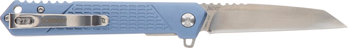 The INERT series belongs to the Schrade DELTA Class. Don't let their slenderness fool you. The INERT's stand up to any task. Featuring AUS-10 Steel Aluminum Handles Ultra Glide Technology and a Liner Locking System. The INERT Features Wharncliffe Blade Shape with a crisp Blue handle.