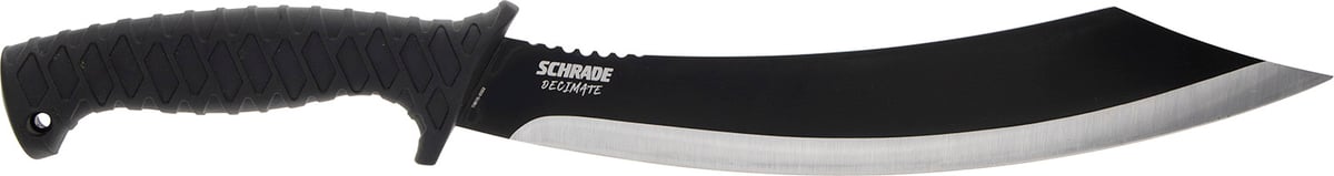 Designed in Columbia MO for the ultimate decimation of brush weeds and other obstacles that keep you from enjoying the outdoors the Decimate series of machetes from Schrade makes no excuses and refuses to back down from a challenge. Featuring 3CR steel and a non-slip rubberized handle the Decimate lineup is designed for hours of cleanup.