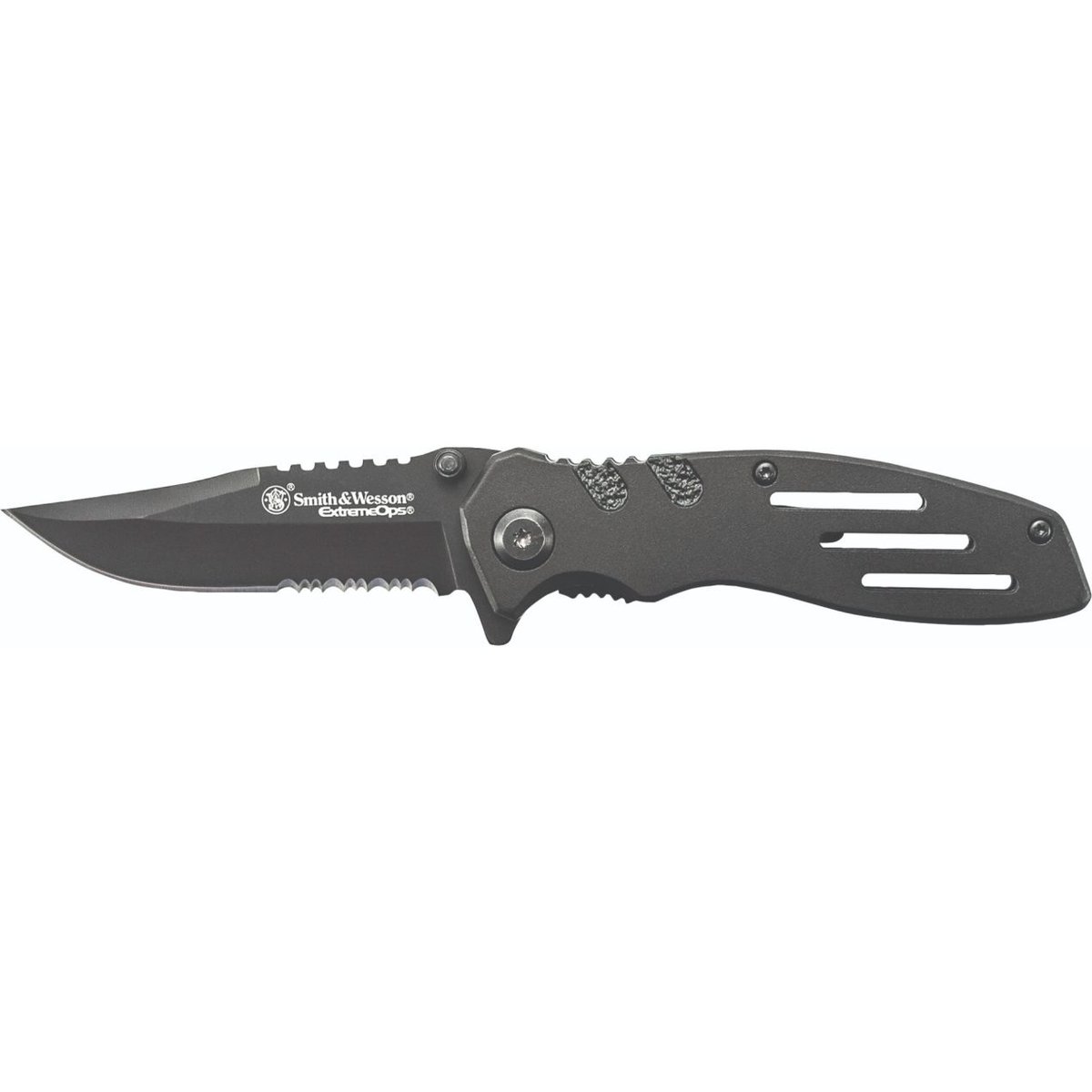 The Smith & Wesson® Extreme Ops Liner Lock Folding Knife is made with a black high carbon stainless steel partially serrated clip point blade. This knife has ambidextrous thumb knobs jimping and an index flipper. The black aluminum handle comes with jimping and a pocket clip.