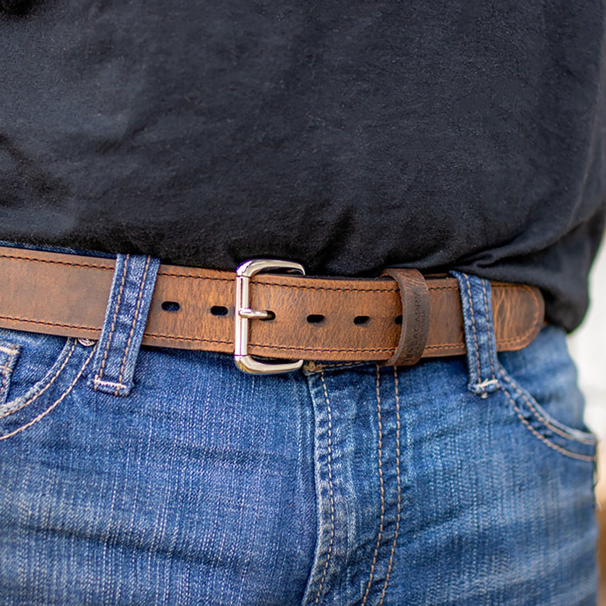 The Classic Carry Belt is handcrafted with vegetable tanned water buffalo and industrial grade bonded nylon thread. The nickel-plated belt buckle is removable, and the double ply leather belt has 7 adjustment holes.
