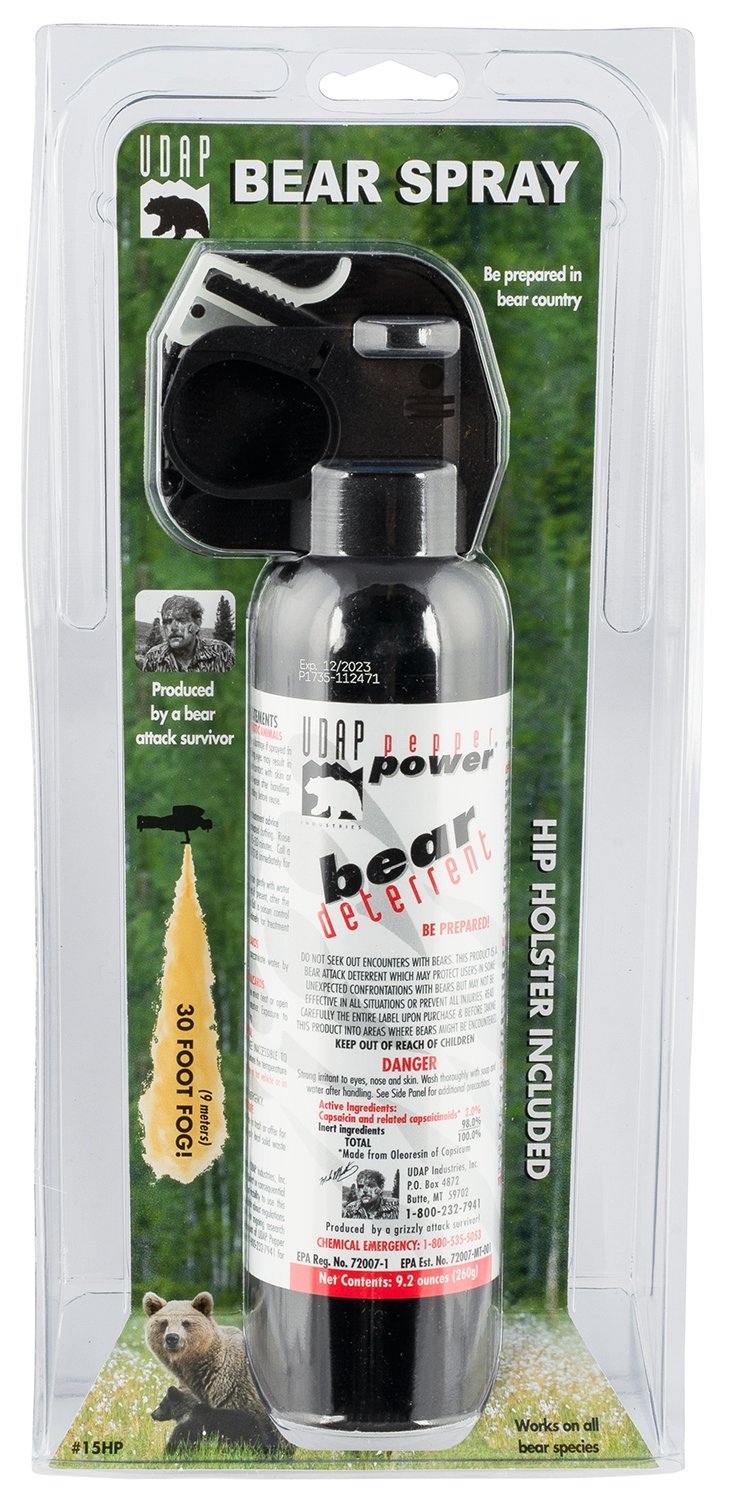 The Super Magnum Bear Spray is the largest bear deterrent registered by the EPA, and it comes with a hip holster. This can is available in 9.2oz/260g. It has the furthest spray distance at 35 feet. It is the hottest bear spray formula available at 2% CRC. Unlike other brands that spray a slower forming narrow fog of bear pepper spray, UDAP Pepper Power Bear Spray deploys a high-volume powerful blast of highly concentrated pepper spray in a dense fog, covering a broader area in a much shorter period of time.