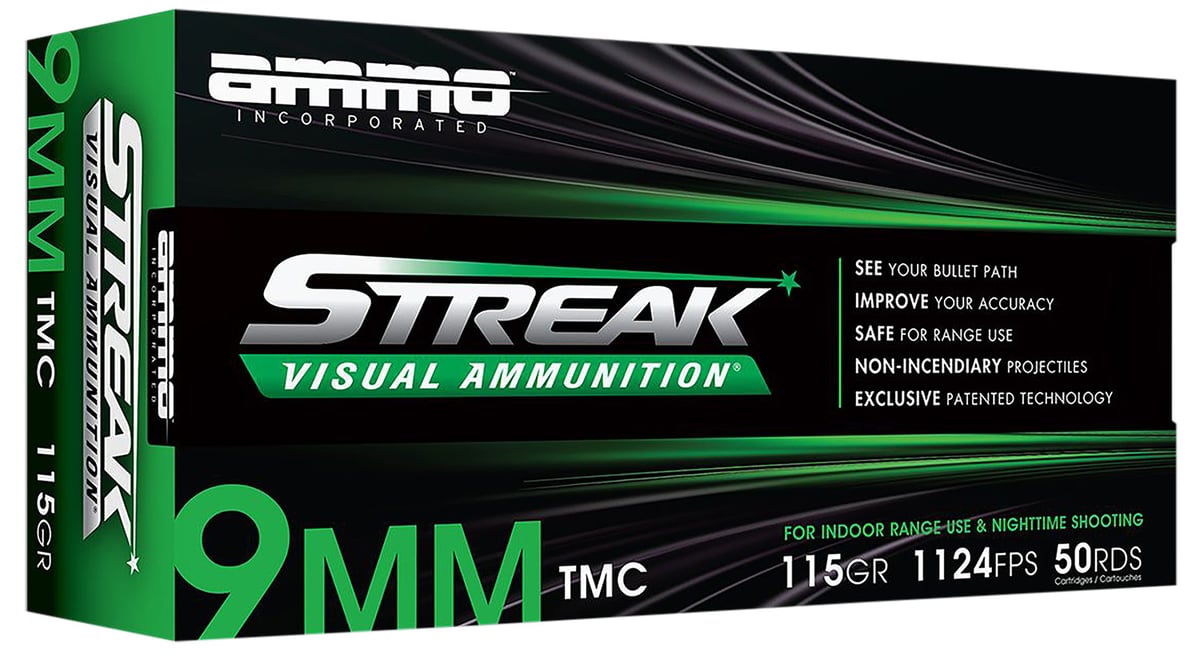 Ammo Inc. STREAK Visual Ammunition’s exclusive and patented technology allows the shooter to visually see the projectile’s path towards its target. STREAK rounds are non-incendiary meaning they don’t generate heat and thus are safe to use in environments where traditional tracers are prohibited and can be a serious fire hazard. The results are game-changing in many aspects for the consumer law enforcement and military. For indoor range use and nighttime shooting.