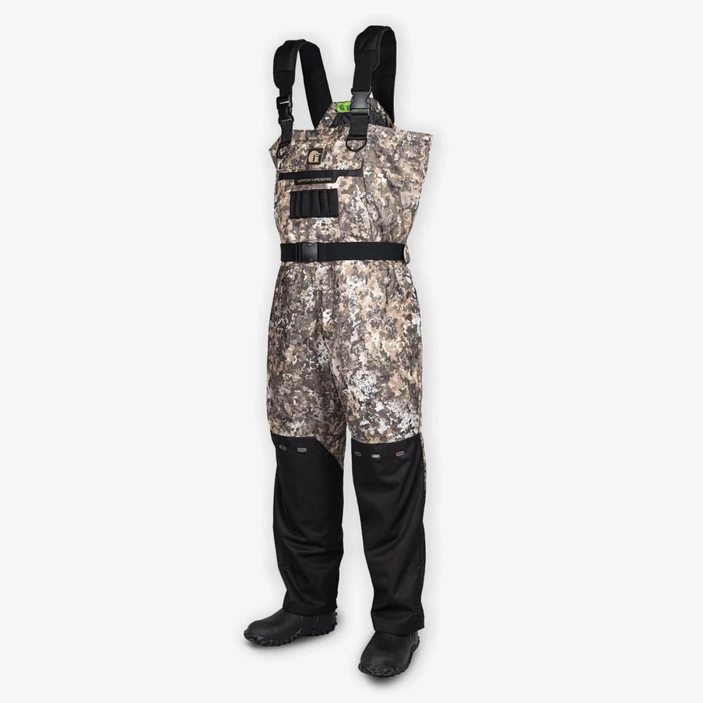 Shield Breathable Insulated Waders bring reliable comfort to the field duck hole or blind. Gator Waders Shield Waders feature a four (4) layer breathable polyester exterior a 100% waterproof membrane 1600g insulated boot with reinforced exterior rubber and aggressive tread and quilted thermal cotton insulation to provide warmth that shields you from the elements but still breathes. Our double-stitched and dual-sealed two-layer seal taped seams combined with a reinforced rear seat and leg gaiters make the Shield Waders unmatched in protection even in the most extreme hunting environments.