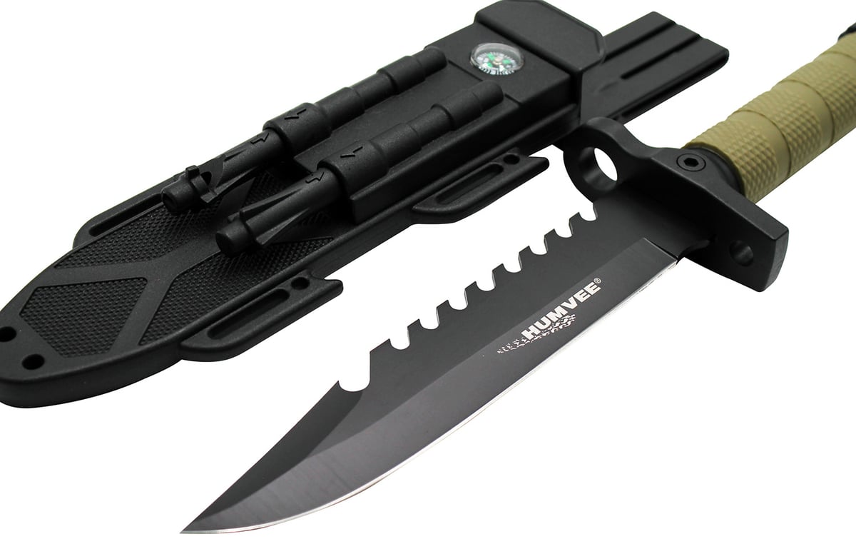 Humvees Next Generation Survival Knife is a solidly built 12.5" knife with textured rubber grips and a hammer strength back. The included sheath has a compass, fire starter and whistle.