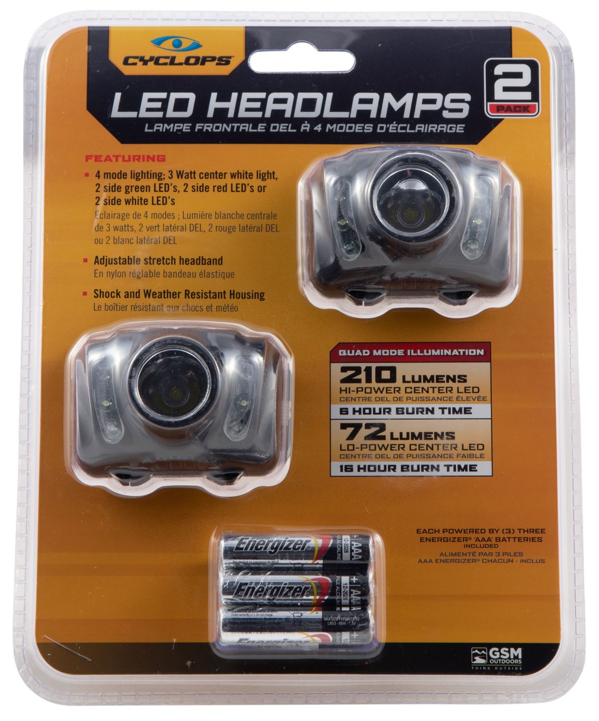 Cyclops 210 Headlamp features a rugged, shock and weather resistant housing. Features a 210 lumens, three power modes- strobe, high and low with four mode lighting- center white LED, two side green LEDs, two side red or white LEDs. Includes three AAA energizer alkaline batteries. Comes in a 2pk.