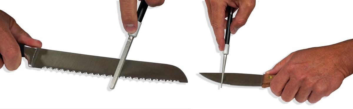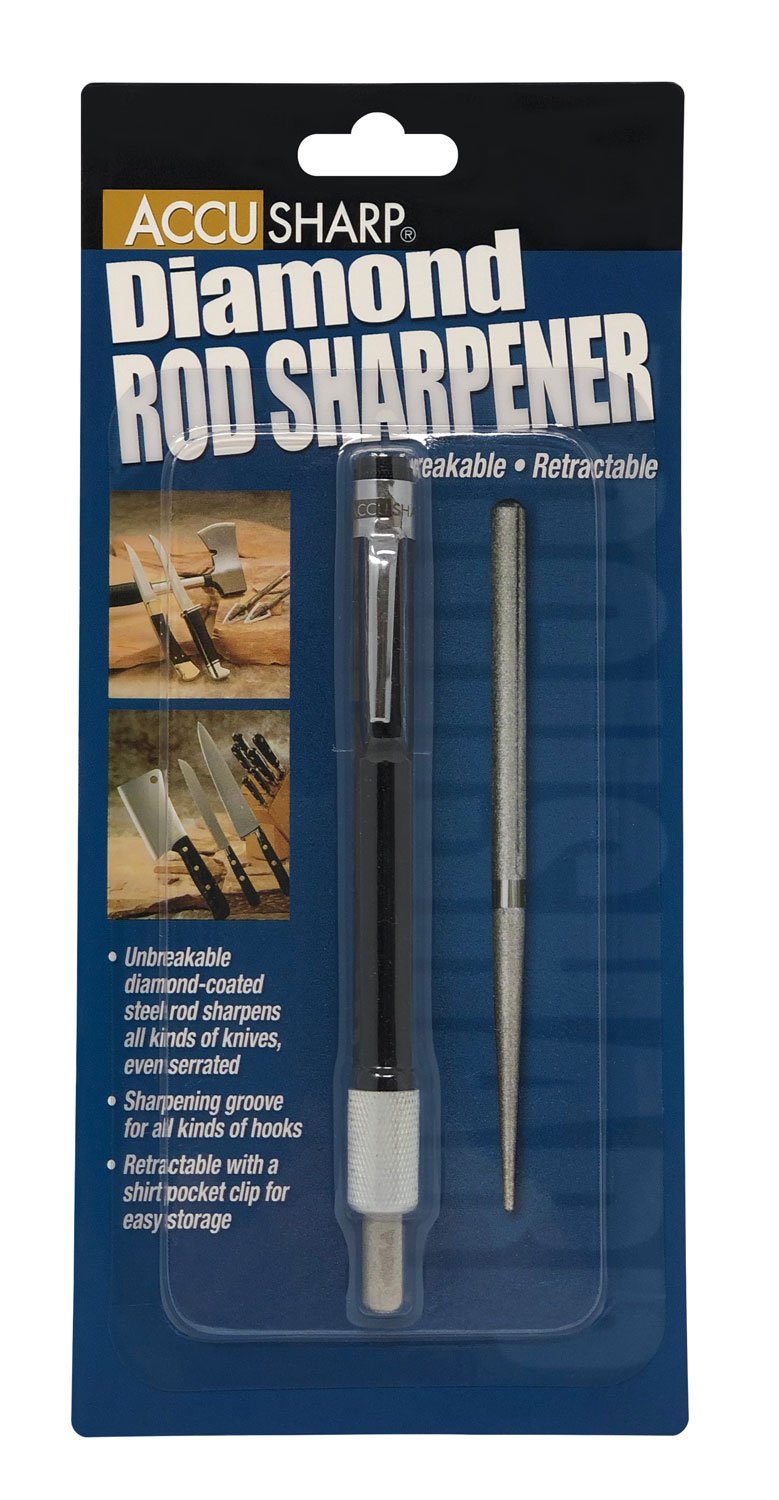 The AccuSharp Diamond Rod Sharpener is an unbreakable diamond-coated steel rod used to sharpen all kinds of knives, including serrated edges. The retractable rod is engineered with a cone-shaped end for use on serrations and tight spaces. The diamond-coated steel rod also has sharpening grooves for use with all kinds of hooks, darts and pointed objects and comes complete with a shirt pocket clip for easy storage. Grit Level- Diamond Rod 280. *Note- Product comes with one diamond coated rod. Image displayed shows both tapered and round rod for a visual representation.