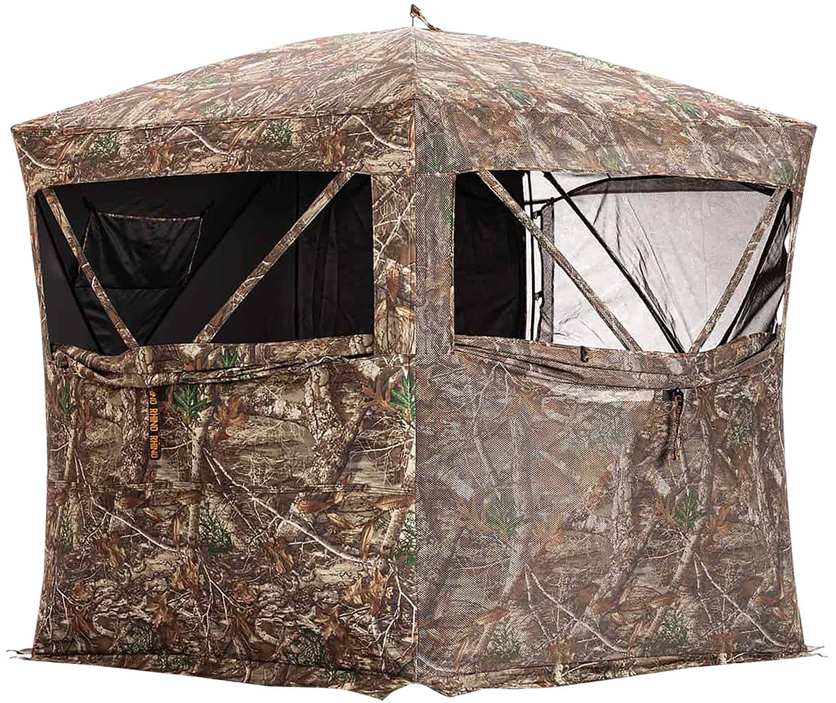 This blind is packed with features hunters will appreciate but one of the biggest is its FULL DOOR. Getting in and out of ground blinds is one of their biggest challenges — the new 180 PRO FD solves the problem thanks to its improved door shape and size. Gone are the days of getting your bow gun crossbow or pack hung up while getting into the blind thanks to this innovative zippered system. Combined with the clear view of the 180 see-through mesh system might make up the ultimate hunting blind. Large windows feature an adjustable silent slide window system. Two see-through panels with head-to-toe see-through mesh. Ultra-durable 300 Denier weatherproof fabric. It’s all here a three-person style blind with a 5-hub design and offered in either Mossy Oak or Realtree camouflage.