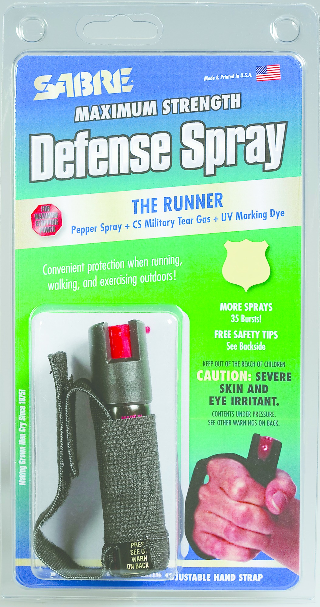 SABRE RED PEPPER/UV DYE .75 OZ STREAM BLACK W/HAND STRAP THE RUNNER NY COMPLIANT