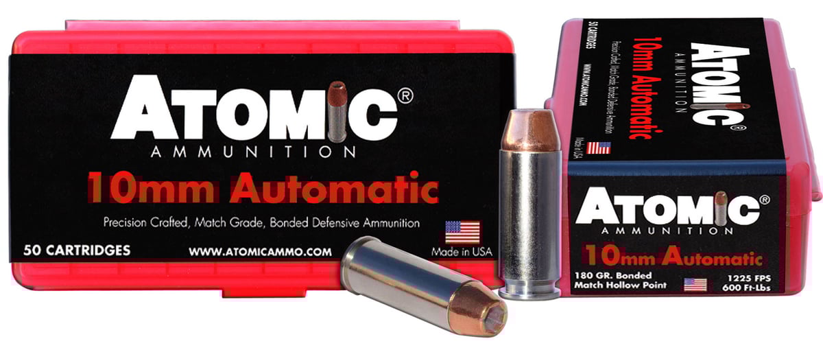 Atomic Ammunitino's 10mm Automatic ammunition is designed to hit hard, penetrate deep and expand to 150 percent of its original diameter. This bullet regularly expands to .70 inches, retains 99 percent of its original mass, and penetrates more than 15 inches of ballistic medium. It is assembled to exact specifications with commercial-grade machinery and is designed to deliver the accuracy that precision shooters demand. Specifications: 10mm Auto/180 gr Bonded Match Hollow Point/50 Per Box/10 Cs